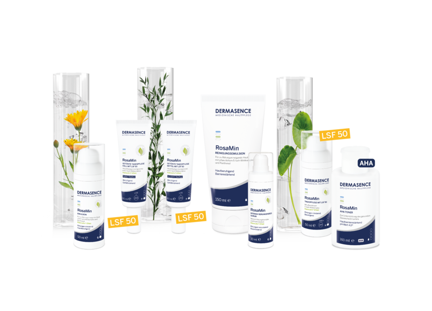 Die DERMASENCE RosaMin-Serie bietet gefäßlabiler, zu Rosacea und Rötungen neigender Haut mit einer Kombination aus vasoaktiven (gefäßstärkenden), antiinflammatorischen und beruhigenden Wirkkomponenten ein nachhaltiges Pflegekonzenpt – auch als Begleitung bei einer dermatologischen Therapie.